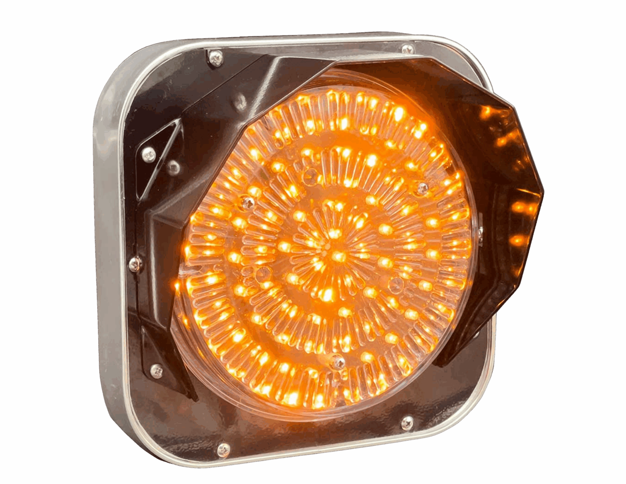 Avec un diamètre de 200 mm, ce feu intègre 95 LED haute intensité orange, offrant une excellente visibilité, même en conditions difficiles. Il est programmable en mode clignotant classique ou en mode flash, activé via un clignoteur intégré. Une cellule crépusculaire permet d’ajuster automatiquement l’intensité lumineuse la nuit pour éviter tout éblouissement.